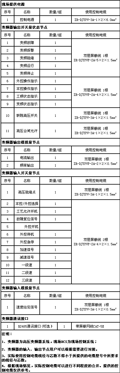 功率電纜的選型必須嚴格按照以下要求選型:電纜的載流量;電纜制造廠家的規范;安裝敷設的方式;電纜長度引起的壓降;符合電力行業規范;符合EMC規范。另變頻器與用戶設備(高壓電源柜、電機)之間的高壓電纜建議采用有屏蔽作用的鎧裝電纜(防止鼠害;滿足EMC要求)。