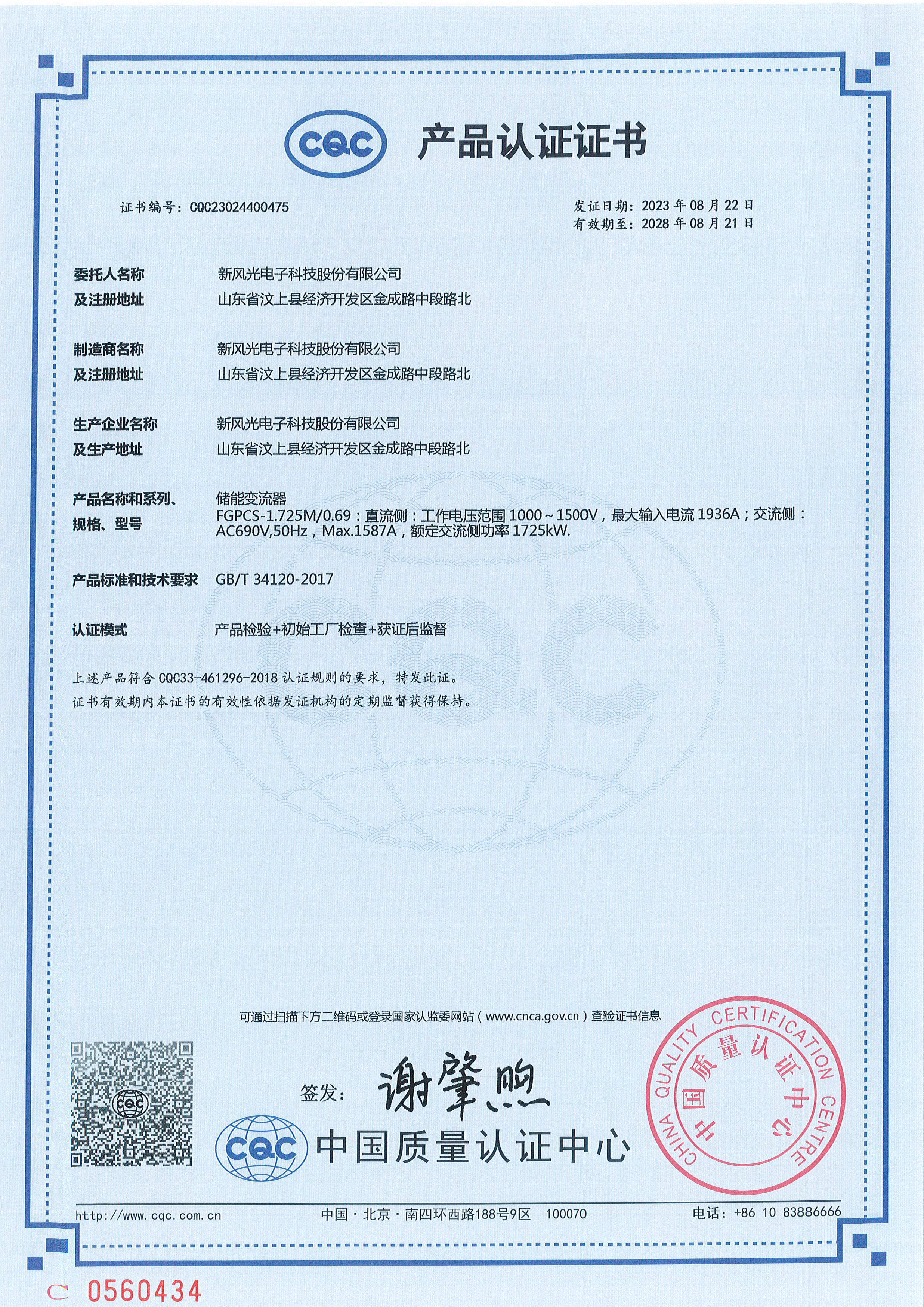 FGPCS-1.725M0.69儲能變流器CQC認證證書