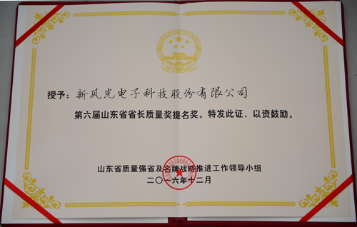 山東省5家企業和4名個人獲得第六屆山東省省長質量獎,新風光電子科技股份有限公司等9家企業和3名個人獲得第六屆山東省省長質量獎提名獎。