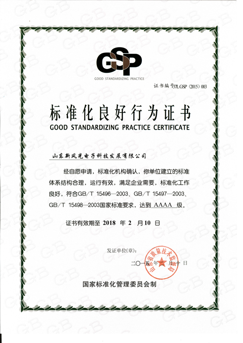 多年來,新風光扎實做好產品質量和標準化工作,虛心向同行學習管理先進做法,借鑒國際公司管理先進經驗。公司所有產品均制訂了《企業產品標準》,并在《企業標準信息公共服務平臺》公開發布。公司通過了ISO9001、ISO14001和OHSAS18001“三標一體”管理體系認證,知識產權管理體系認證,AAAA標準化良好行為認證,歐盟CE認證,先后主持并參加了11部國家及行業標準的起草審定工作。