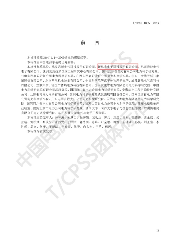 近日獲悉,由中國電源學會組織發起,新風光電子科技股份有限公司在內的多家知名電能質量治理企業、科研院所及高校等30家單位共同參與編制的團體標準—《中壓鏈式靜止無功發生器》T/CPSS1005—2019,于2019年8月1日正式實施。截止目前,新風光公司先后主持并參與了16部國家、行業及團體標準的起草審定工作。