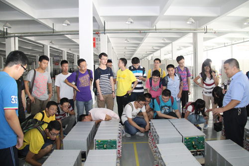 公司技術(shù)中心負(fù)責(zé)人帶領(lǐng)學(xué)生們深入車間參觀了解高壓變頻器、高壓動態(tài)無功補(bǔ)償產(chǎn)品和變流器等三大主導(dǎo)產(chǎn)品的生產(chǎn)、裝配、檢測等各個工藝流程。公司先進(jìn)生產(chǎn)線的車間讓同學(xué)們眼前一亮,面對眾多先進(jìn)的生產(chǎn)、檢測、試驗儀器設(shè)備,使得同學(xué)們駐足觀看,不時詢問。并對新風(fēng)光公司規(guī)模的不斷發(fā)展壯大、蒸蒸日上的強(qiáng)勁發(fā)展勢頭贊嘆不已。