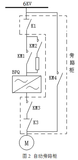 根據用戶現場的實際情況,旁路柜采用了一拖一工變頻自動轉換方案。如下圖2所示。旁路柜中,共有2個高壓隔離開關和2個真空接觸器,為了確保不向變頻器輸出端反送電,KM3與KM4采用電氣互鎖。當K1、K3、KM1和KM3閉合,KM4斷開時,電機變頻運行;當KM1、KM3斷開,KM4閉合時,電機工頻運行,此時變頻器從高壓中隔離出來,便于檢修、維護和調試。