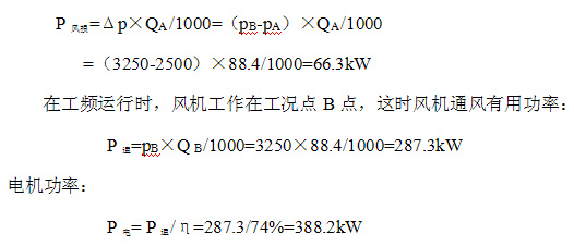 主通風機為軸流式排風機,風機兩臺,一用一備,每臺功率800kW,下圖4為AGF606-2.44-1.3-2特性曲線圖,R1為礦井的通風阻力曲線,R2為調整風門后的阻力曲線,由圖4可知,當需風量為QA時,動葉角度為-50時、風機效率小于72%,這時需將動葉角度調至-100(圖中的B點),以提高風機的運行效率,這時風機的運行效率約為74%,由礦井的通風阻力曲線R1和風機的性能曲線圖,可知風機在動葉角度為-50時,效率較高,這時可通過變頻器調節風機轉速調至A點,以滿足風量要求,這時風機運行在較佳狀態,此時變頻器的運行平均功率為:P變=276.3kW,變頻運行與風機工頻運行相比風壓損失功率為: