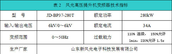 風光高壓提升機變頻器為可以四象限運行的能量回饋型變頻器,采用較先進的矢量控制技術,加速時可以實現較大的轉矩輸出,加速時間縮小至較短,而減速時,可以控制電機在四象限運行,輸出制動轉矩,減速時間縮至較短,同時,將勢能轉化為電能,回饋至電網,從而達到節能的目的。風光高壓提升機變頻器具體參數如表2所示。