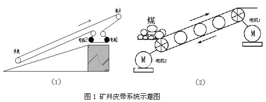 (2)卸完煤后的空皮帶經(jīng)過一個轉(zhuǎn)向輪,分別通過1#電機拖動的主動滾筒,和2#電機拖動的從動滾筒后,皮帶在經(jīng)過一個導(dǎo)向輪運行到井底完成一次運煤過程。