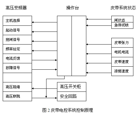 皮帶機在井下并不是單獨使用,往往是多部輸送機一起工作,因此啟動順序必須是前一級設(shè)備啟動后,下一級設(shè)備方可啟動。在前級閉鎖解除后,對皮帶電控系統(tǒng)的各部狀態(tài)進行檢測判斷,具備起車條件后,才能啟動。皮帶電控系統(tǒng)控制原理如圖2所示。