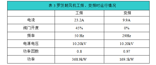 2015年6月該公司節(jié)能服務(wù)中心隨機(jī)對羅茨鼓風(fēng)機(jī)高壓變頻器進(jìn)行了測試,記錄數(shù)據(jù)如表3所示。