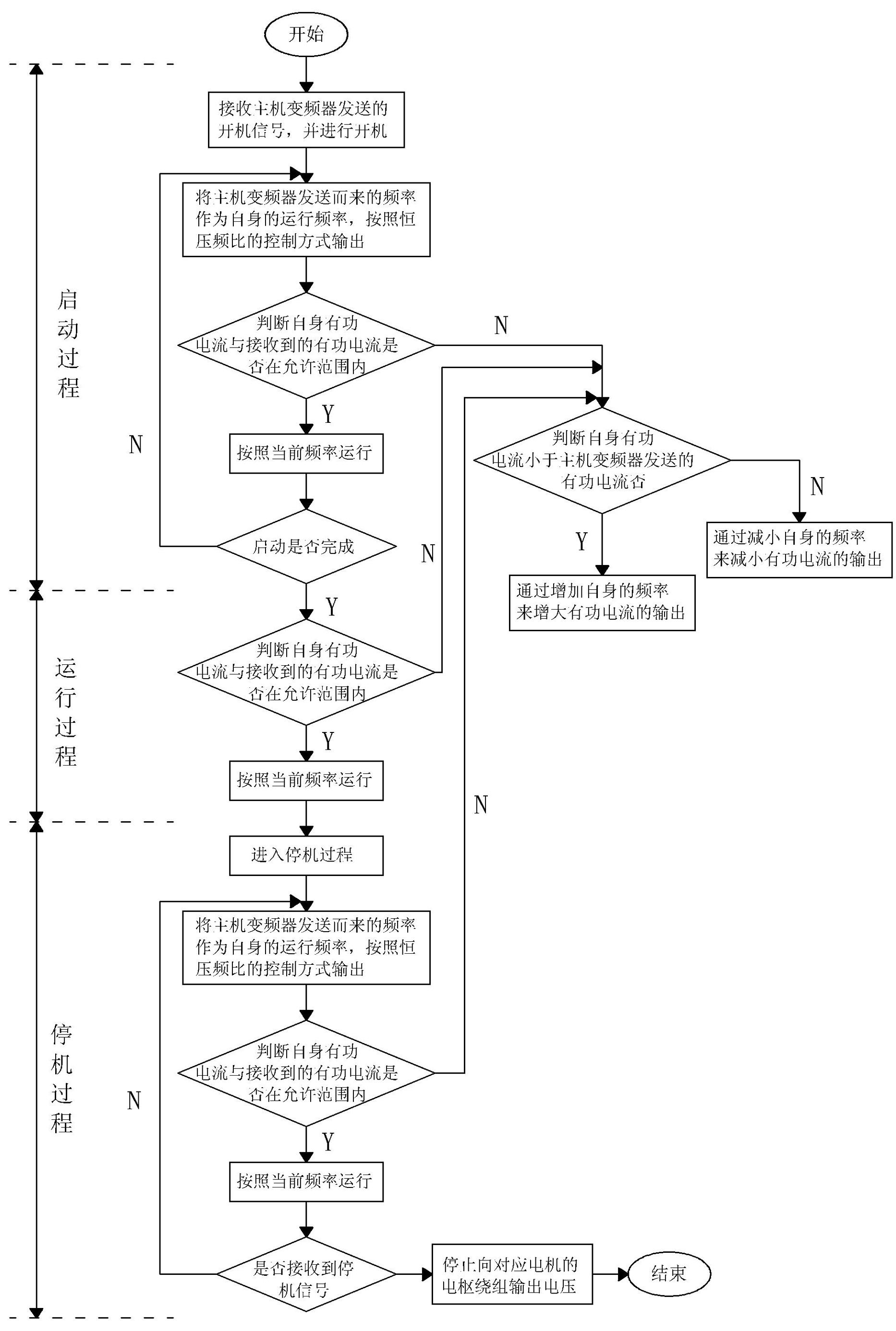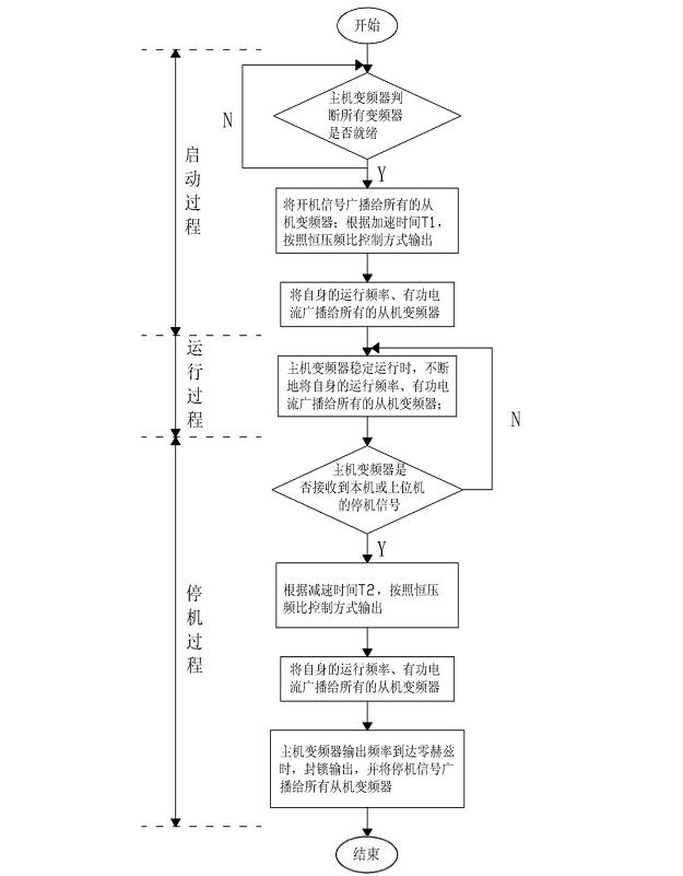 當主機執行開停機后,會根據預先設置好的頻率上升時間和下降時間進行升頻、降頻。并將主機變頻器運行頻率作為基準頻率廣播發給各個從機變頻器。從機變頻器接收到主機變頻器發來的基準頻率后,將自身運行頻率調整到基準頻率。
