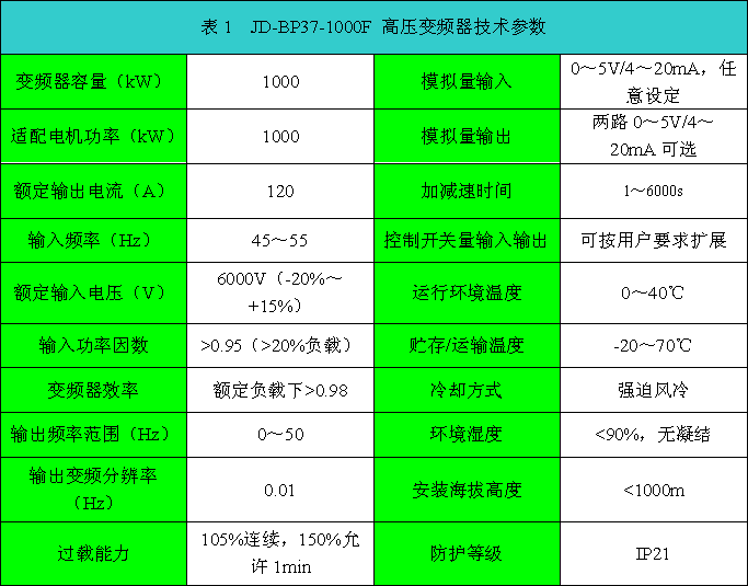 JD-BP37-1000F 高壓變頻器技術(shù)參數(shù)如表1所示。