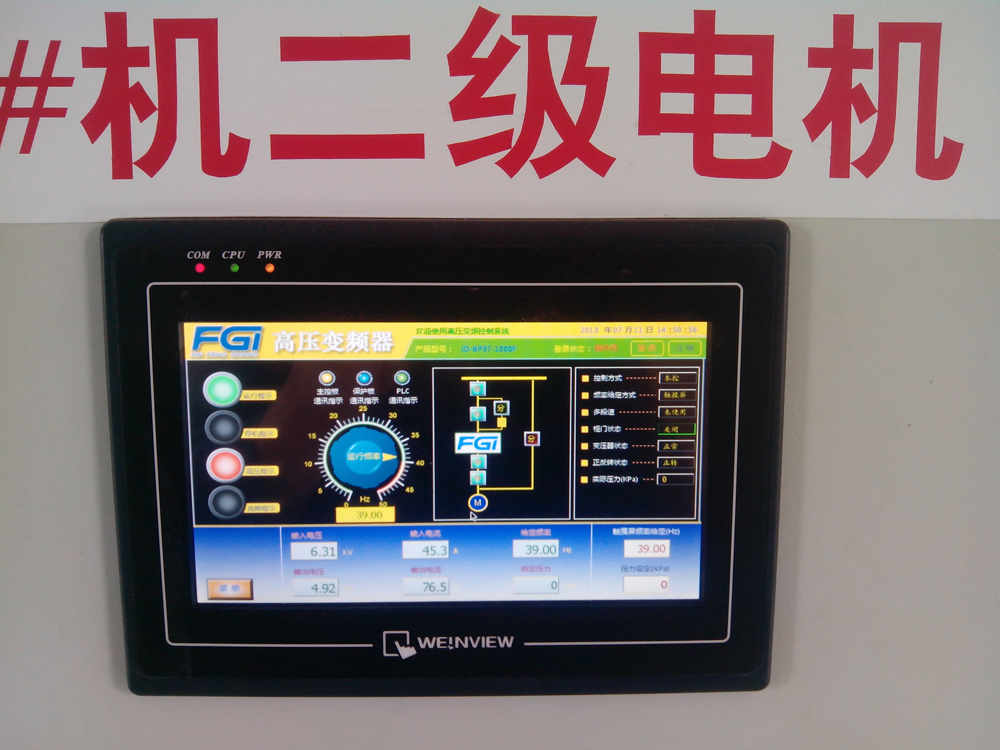 焦家寨煤礦通風(fēng)機(jī)選用JD-BP37-1000F風(fēng)光變頻器4套,于2013年7月2日變頻器一次性投運(yùn)成功,至今運(yùn)行正常。變頻運(yùn)行后,風(fēng)門全部打開,用戶根據(jù)所需風(fēng)量風(fēng)壓實(shí)時(shí)調(diào)節(jié)變頻器頻率,進(jìn)而調(diào)節(jié)通風(fēng)機(jī)運(yùn)行工況。不僅完全滿足煤礦生產(chǎn)工藝要求,而且用戶操作非常方便。現(xiàn)場(chǎng)調(diào)試中發(fā)現(xiàn),1#風(fēng)機(jī)的前后兩級(jí)電機(jī)采用高壓變頻器分別獨(dú)立控制,可以有效避免喘振現(xiàn)象?,F(xiàn)場(chǎng)測(cè)試1#風(fēng)機(jī)有關(guān)數(shù)據(jù)如下。一級(jí)電機(jī)運(yùn)行參數(shù),運(yùn)行頻率:43Hz,變頻輸入電流:40.3A,輸入電壓:6.22kV,輸出電壓:5.35kV,輸出電流:75.3A;二級(jí)電機(jī)運(yùn)行參數(shù),運(yùn)行頻率:39Hz,變頻輸入電流:45.3A,輸入電壓:6.31kV,輸出電壓:4.92kV,輸出電流:76.5A。人機(jī)界面現(xiàn)場(chǎng)照片如圖4所示。