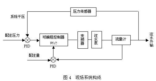 系統閉環控制過程如下:由智能傳感器對各運行注水泵進行實時數據監控和處理,即采集和傳輸注水泵、站的運行參數,如:泵的排量Q單、電機電流I、泵進、出口壓力P泵,注水站出口干壓P干、總排量Q總、平均單耗等,并將這些控制參數(Q單、I、P泵,P干、Q總、)與其期望值及泵本身的特性曲線進行對比和優化計算。其中,注水站干壓和總流量是系統所需監測和控制的兩個最主要參數。本系統中,一方面在泵出口管線上安裝一只高可靠性壓力傳感器,將實測的壓力信號與系統的配注壓力(期望值)相比,并將其差值送往過程參數調節器(PID)進行比例和積分運算,最后將輸出結果送給可編程控制器(PLC);另一方面在泵入口管線上安裝一只流量計,用于監測系統實際總流量,將該值與系統配注量的差值再進行一次PID整定,最后將輸出結果送給PLC。PLC根據所接收的兩個PID整定信號,利用模糊推理的方法,在滿足系統干壓的前提下,系統及時自動調整高壓變頻器的輸出頻率從而控制變頻泵的轉速。由離心泵原理知,泵轉速的變化可引起相應的排量變化,通過頻率的變化以達到期望的排量值。通過上述閉環控制,使系統的實際壓力和排量與系統的配注壓力和配注量相接近。系統設計為閉環控制系統,流量和壓力為系統的兩個主要參數,將系統實測的流量和壓力信號與地質要求的流量和壓力(期望值)進行雙PID調節;通過模糊推理的方法自動尋優控制,根據推理結果,系統及時自動調整高壓變頻器的輸出,并自動計算出變頻器的較佳運行頻率。