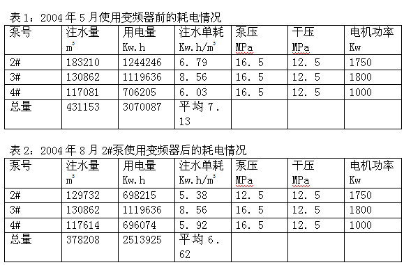 該變頻器于2004年8月在新三聯2#注水電機安裝正式運行,使用變頻器前后的耗電情況統計見下表: