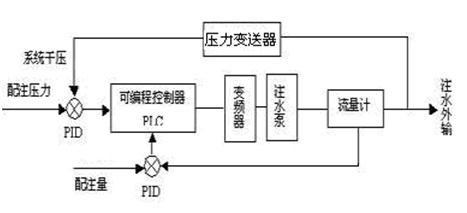 現場系統構成框圖如圖3所示。系統閉環控制過程如下:由智能壓力變送器對各運行注水泵進行實時數據監控和處理,即采集和傳輸注水泵、站的運行參數,如:泵的排量Q單、電機電流I、泵進、出口壓力P泵,注水站出口干壓P干、總排量Q總、平均單耗等,并將這些控制參數(Q單、I、P泵、P干、Q總)與其期望值及泵本身的特性曲線進行對比和優化計算。其中,注水站干壓和總流量是系統所需監測和控制的兩個最主要參數。本系統中,一方面在泵出口管線上安裝一只高可靠性壓力變送器,將實測的壓力信號與系統的配注壓力(期望值)相比,并將其差值送往過程參數調節器(PID)進行比例和積分運算,最后將輸出結果送給可編程控制器(PLC);另一方面在泵入口管線上安裝一只流量計,用于監測系統實際總流量,將該值與系統配注量的差值再進行一次PID整定,最后將輸出結果送給PLC。PLC根據所接收的兩個PID整定信號,利用模糊推理的方法,在滿足系統干壓的前提下,系統及時自動調整高壓變頻器的輸出頻率從而控制變頻泵的轉速。由柱塞泵原理知,泵轉速的變化可引起相應的排量變化,通過頻率的變化以達到期望的排量值。通過上述閉環控制,使系統的實際壓力和排量與系統的配注壓力和配注量相接近。系統設計為閉環控制系統,流量和壓力為系統的兩個主要參數,將系統實測的流量和壓力信號與地質要求的流量和壓力(期望值)進行雙PID調節;通過模糊推理的方法自動尋優控制,根據推理結果,系統及時自動調整高壓變頻器的輸出,并自動計算出變頻器的較佳運行頻率。