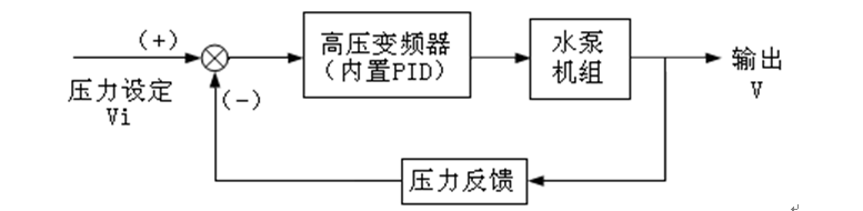 針對現場存在的問題,系統優化改造主要需解決兩方面的問題:第一,在滿足系統配注水量的基礎上盡可能減少排量損失;第二,在滿足注水壓力的前提下盡可能減少泵管壓差,即減少壓力損失。因此采用的是注水系統恒壓控制方式,其工作原理如圖1所示,測量元件為壓力傳感器,將它設在柱塞水泵機組出水管網上,Vi為恒定注水壓力設定值,注水壓力V作為輸出量,構成閉環控制系統。變頻器內部的PLC采集注水壓力值V與用戶給定值Vi進行比較和運算,通過PID進行調整,將結果轉換為頻率調節信號送至變頻器,直至達到注水壓力的給定值Vi。不管系統注水流量如何變化,注水壓力值V始終維持在給定壓力值Vi附近。