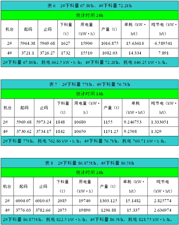 為了進一步測試節能效果,分別統計2#、4#焙燒爐在不同下料量的情況下,除塵ID風機的耗電量,統計數據如表6、表7、表8所示。
