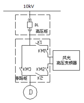 旁路柜主要配置:三個高壓斷路器(KM1、KM2、KM3)和兩個刀閘隔離開關K1、K2。KM2與KM3實現電氣互鎖,當KM1、KM2閉合,KM3斷開時,電機變頻運行;當KM1、KM2斷開,KM3閉合時,電機工頻運行。另外,KM1閉合時,K1操作手柄被鎖死,不能操作;KM2閉合時,K2操作手柄被鎖死,不能操作。
