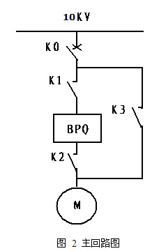 根據(jù)用戶現(xiàn)場要求,此次兩臺(tái)變頻器均采用一拖一控制方案,采用手動(dòng)旁路控制,其一次電路如下圖2所示: