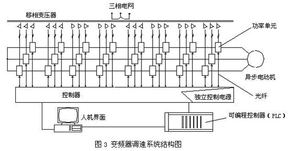 JD-BP38系列高壓變頻調(diào)速系統(tǒng)的結(jié)構(gòu)見圖3,由移相變壓器、功率單元和控制器組成。變頻器共有24個(gè)功率單元,每8個(gè)功率單元串聯(lián)構(gòu)成一相。