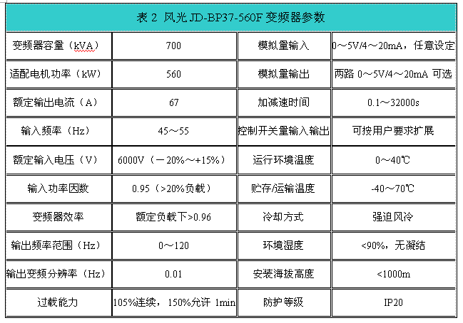 鄒平齊星開發區熱電有限公司6號機(155MW)排粉風機改造選用風光JD-BP37-560F高壓變頻器2臺、并配置手動旁路柜,用于變頻/工頻切換。采用“一拖一”變頻控制。風光JD-BP37-560F變頻器參數如表2所示。
