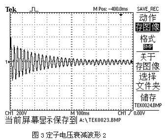 由于變頻器輸出的是PWM波,其相位不易觀察,測得在工頻狀態下的電壓波形進行進一步的分析。因為變頻器50Hz時的輸出電壓與工頻電壓作用在電機上基本時等效的,并不影響分析結果。圖4是一2.2KW電機在工頻電源下突然斷開電源后的電壓波形圖,由該圖可以看出,電壓波形沒有跳變,所以斷開瞬間感應電動勢與電源電壓是同相位的,其幅值也是基本相等的。隨著剩磁的慢慢消失,電壓幅值逐漸降低,同時伴隨著轉速的降低感應電動勢的頻率逐漸下降,其相位也逐漸與電源相位拉開。頻率越低,單位時間內拉開的相位差也就越大。