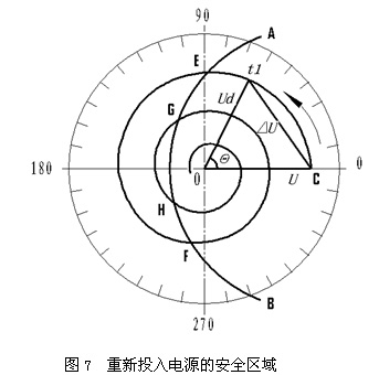 H點以后三個安全投入工頻電源的時間范圍,都是由相位和幅值共同作用的結果。我們也還可以分別從相位和幅值兩個方面入手來尋求解決辦法。